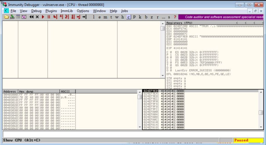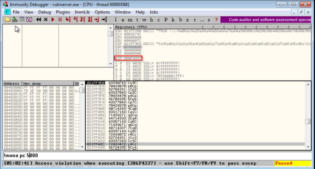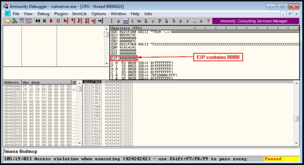 Comme nous nous y attendions, l’EIP contient BBBB et ESP contient les C Nous voulons que EIP pointe vers notre shellcode et puisque notre shellcode sera sur la pile, EIP devrait pointer vers une instruction JMP ESP qui redirige l’exécution vers le shellcode sur la pile.