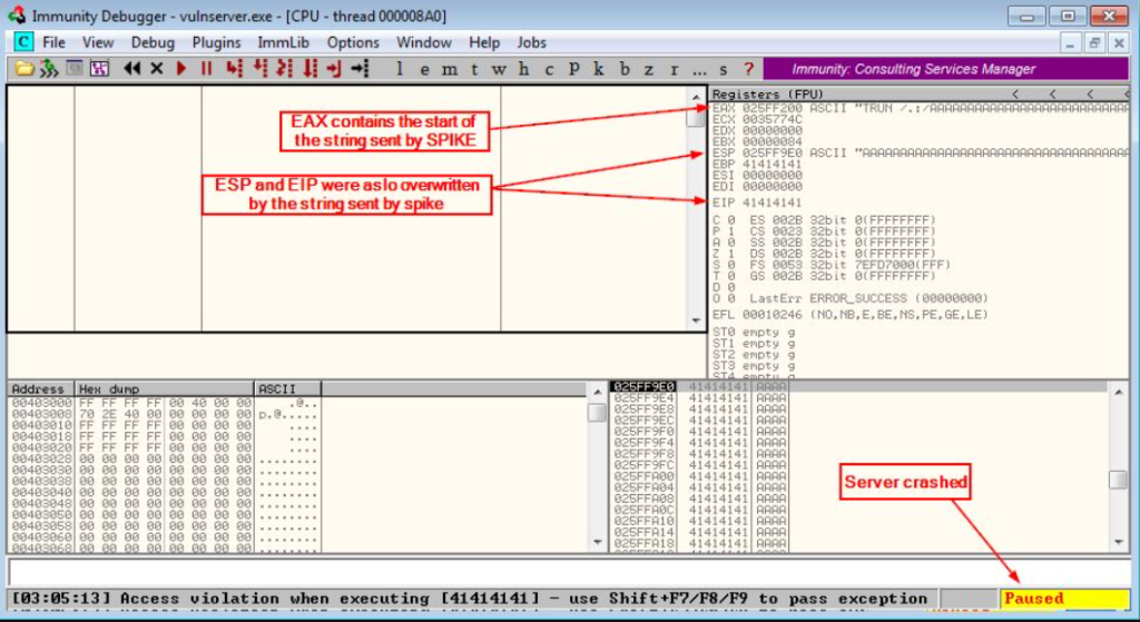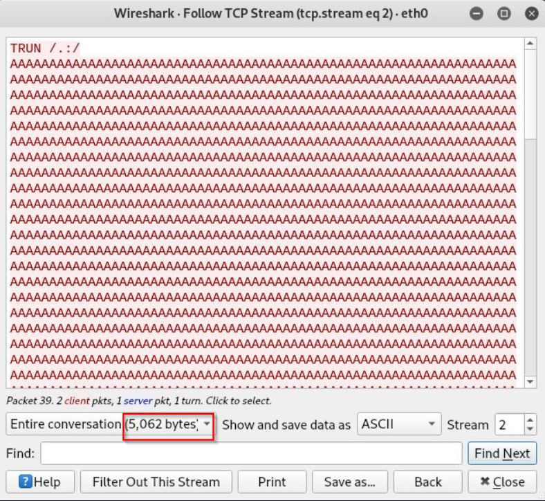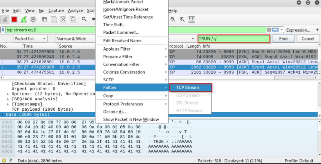 Attendez que le serveur plante, vous verrez que le registre EAX contient cette chaîne « TRUN /.:/ » et un tas de A et EIP et ESP ont également été écrasés, tournez maintenant vers Wireshark et recherchez la chaîne « TRUN /. :/ » pour trouver le paquet qui a causé le crash et faites un clic droit sur le paquet -> Suivre -> Flux TCP