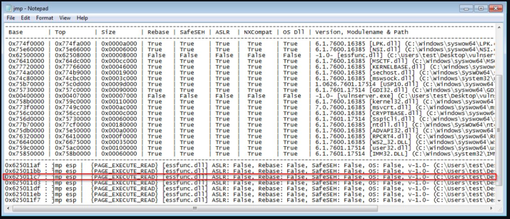 La commande précédente créera un fichier texte dans le répertoire du débogueur d’immunité avec le nom « jmp.txt » Dans le fichier « jmp.txt », nous choisirons un pointeur de la DLL « essfunc.dll » car il est fourni avec vulnserver et cela maintient l’exploit compatible même si l’application est installée sur une autre machine, aussi ce pointeur a beaucoup de sécurité fonctionnalités désactivées comme (ASLR, SafeSEH, etc.)