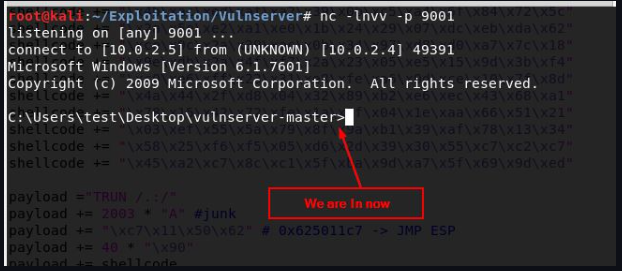 9001 ——–> port d’écoute sur la machine de l’attaquant Conseil : si vous rencontrez un problème de plantage du serveur et que vous n’exécutez jamais le shellcode, désactivez la protection DEP pour vulnserver en procédant comme suit :